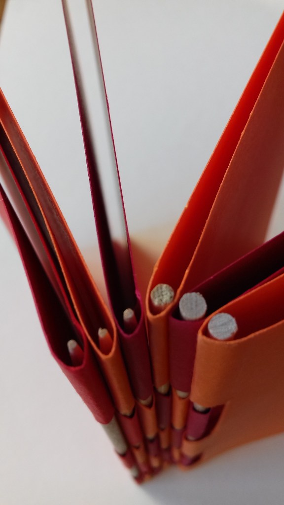 C’est un technique simple qui repose sur le principe du tissage de papier autour de bâtonnets. Une forme de reliure originale et élégante pour mettre en valeur les magnifiques dessins de vos enfants.